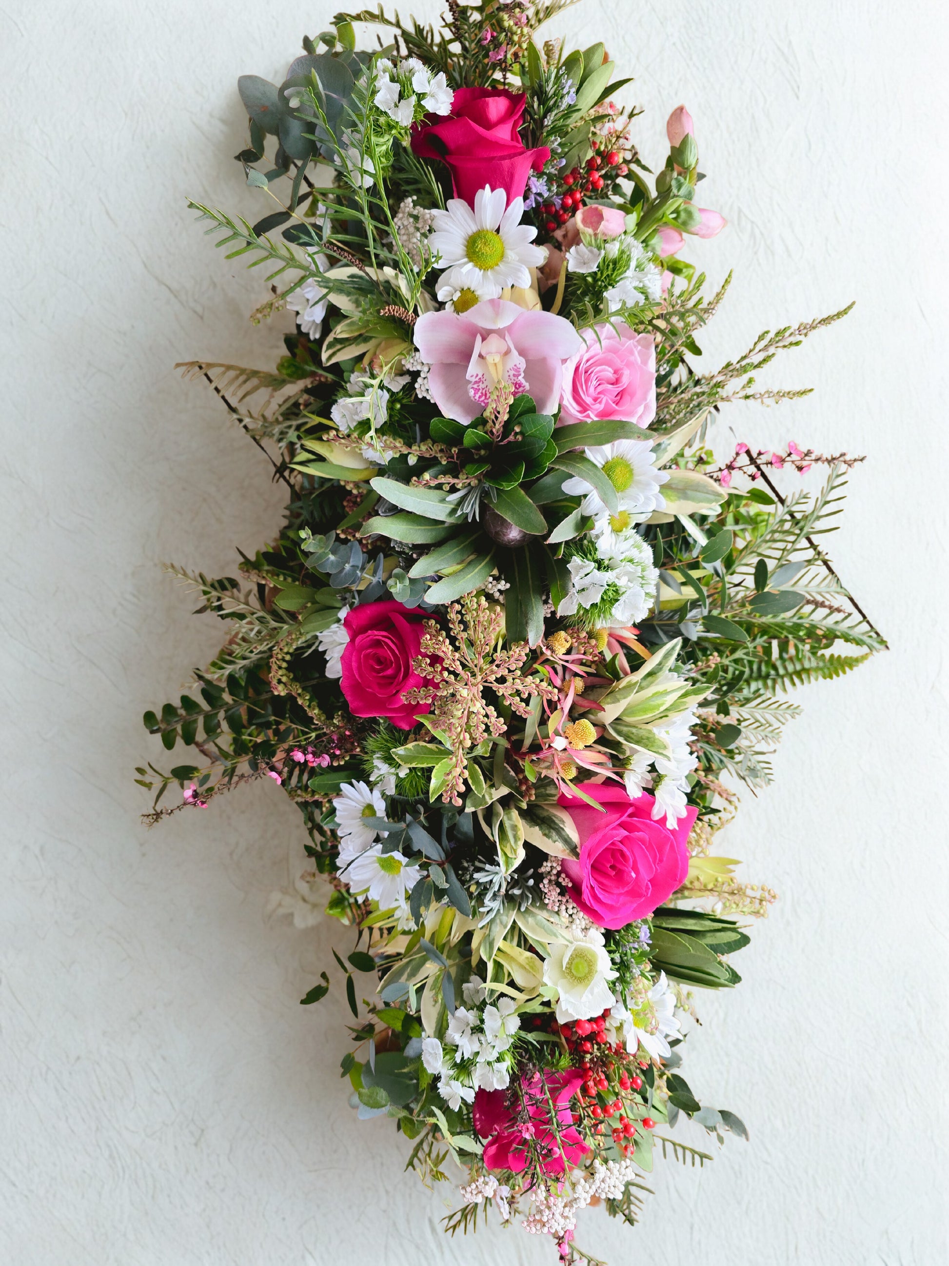 Our Ngakau Aroha Casket Spray is designed with grace and care to honor a life beautifully lived. Featuring a thoughtful selection of fresh, seasonal blooms in tones of your choice.